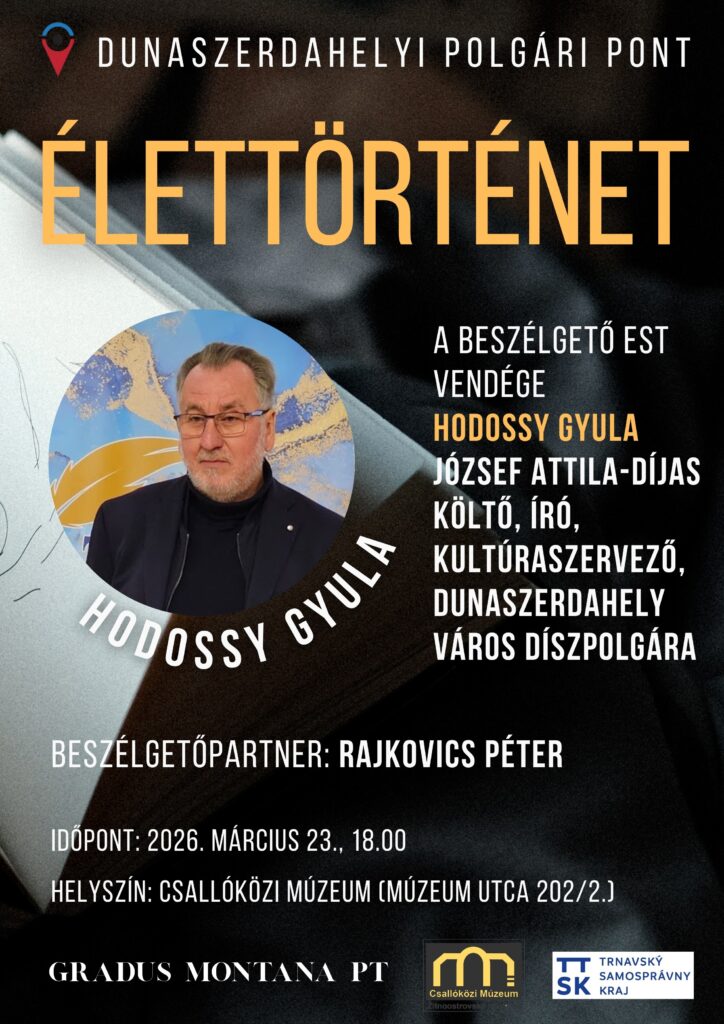Az est vendége 𝐇𝐨𝐝𝐨𝐬𝐬𝐲 𝐆𝐲𝐮𝐥𝐚 József Attila-díjas költő, író, a SZMÍT elnöke. A vele való beszélgetés során bepillantást nyerhetünk alkotói pályájába, személyes élményeibe és azokba a gondolatokba, amelyek munkásságát és életútját formálták.